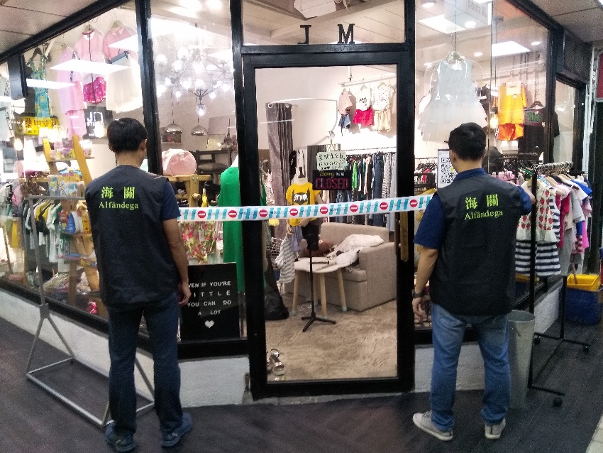 於2016年5月19日,較早前海關接獲市民以電話舉報,指中區一店舖涉嫌售賣侵權服裝,經部署後,採取突擊搜查行動,查獲侵權成衣及背包約1480件,市值約50萬澳門元,行動中帶走1名本澳男性店主協助調查。