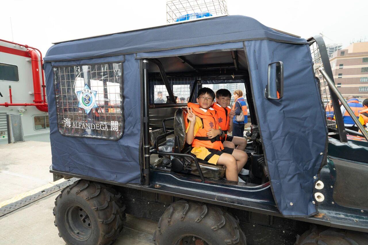 隨後,海關人員向參觀者講解海上執勤與救援的常用裝備,包括通訊和潛水器材、警用無人機設備、橡皮艇及水陸兩用車等,並讓參觀者近距離接觸相關裝備,加深大家對海上救援工作的認知。