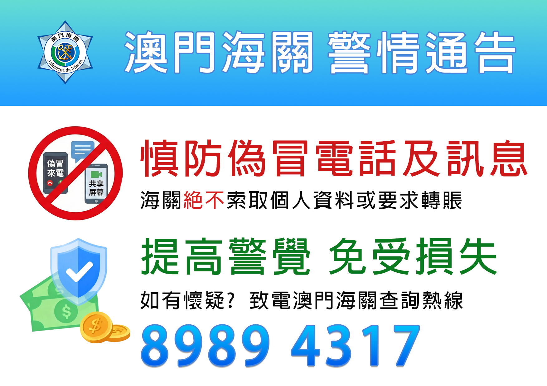 海关重申不会透过电话录音、短讯或手机软件等要求任何人进行转账或索取个人资料,并已将上述事件通报司法警察局。市民务必提高警觉,慎防受骗,如有怀疑,可致电澳门海关查询热线89894317瞭解。