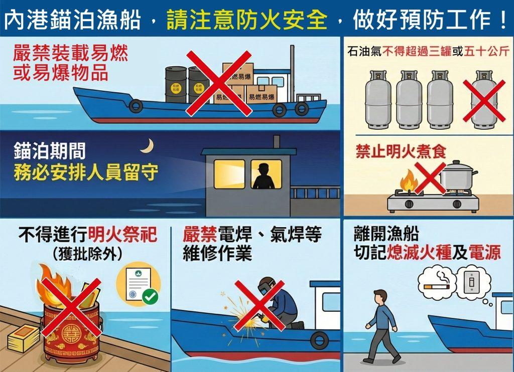 渔民须严格遵守海事及水务局第1/2022号《告示》及第3/2022号《告示》的船舶停泊及航行应遵规则,包括内港锚泊渔船不得装载超过三罐或五十公斤以上的液化石油气、未经海事及水务局许可严禁在渔船上进行明火祭祀、锚泊期间须安排人员留守渔船等。