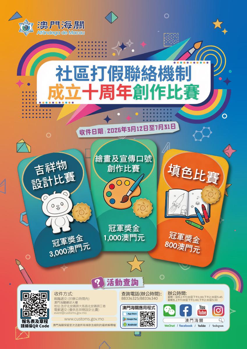 比赛设有多个奖项及奖金,得奖者最高可获得3,000澳门元现金奖(视项目而定)。有关报名详情和比赛章程可参阅海关网页www.customs.gov.mo,或扫描海报内二维码了解更多。如有查询,可于办公时间内致电8833 6325或8833 6340。