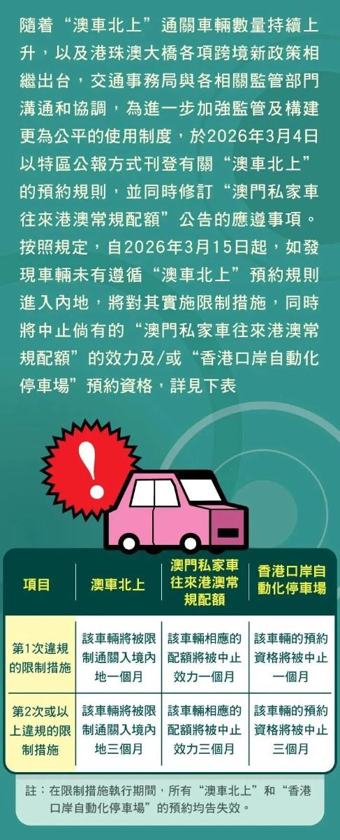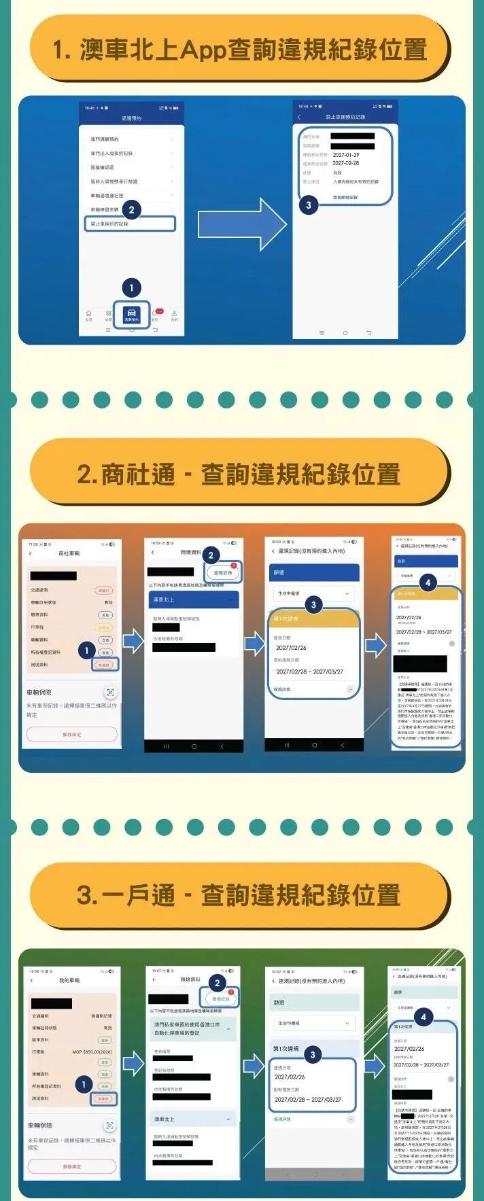 对于违规车辆,交通事务局将透过短讯、一户通提示信息、“澳车北上”系统推送信息通知相关申请人(车主)和驾驶者;相关人士亦可透过“澳车北上”系统的查询页面,以及“一户通/商社通”内“我的车辆/商社车辆”之跨境车辆资料中查阅相关纪录。