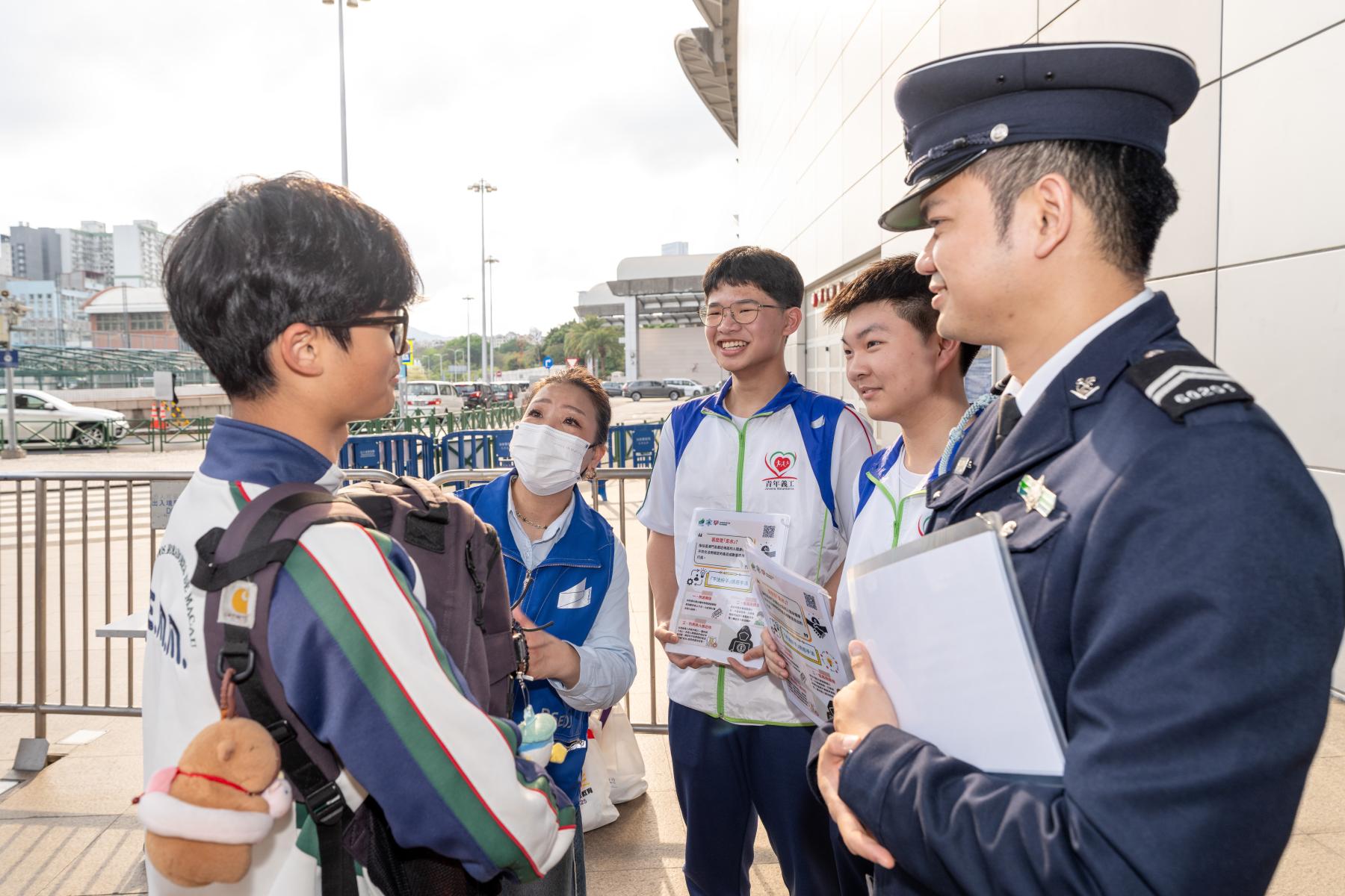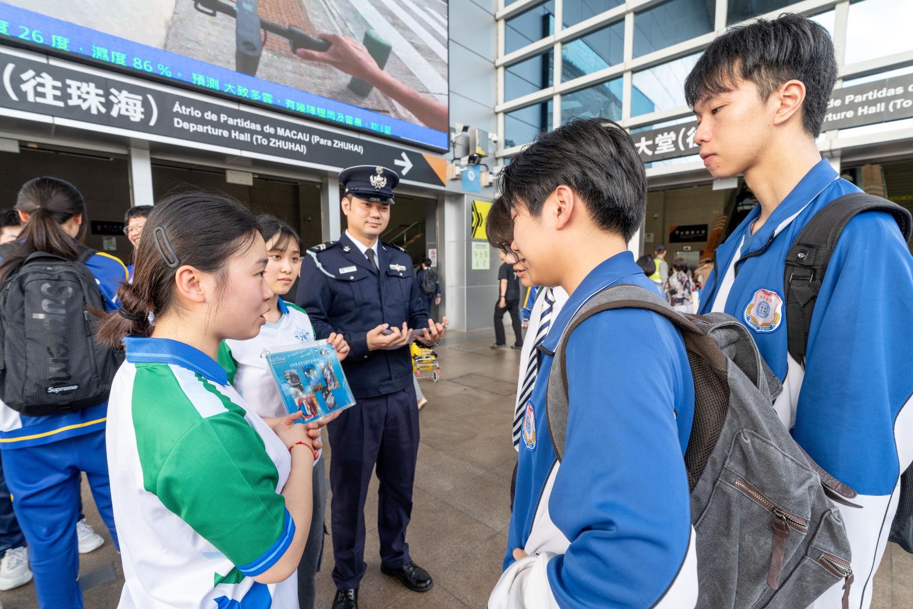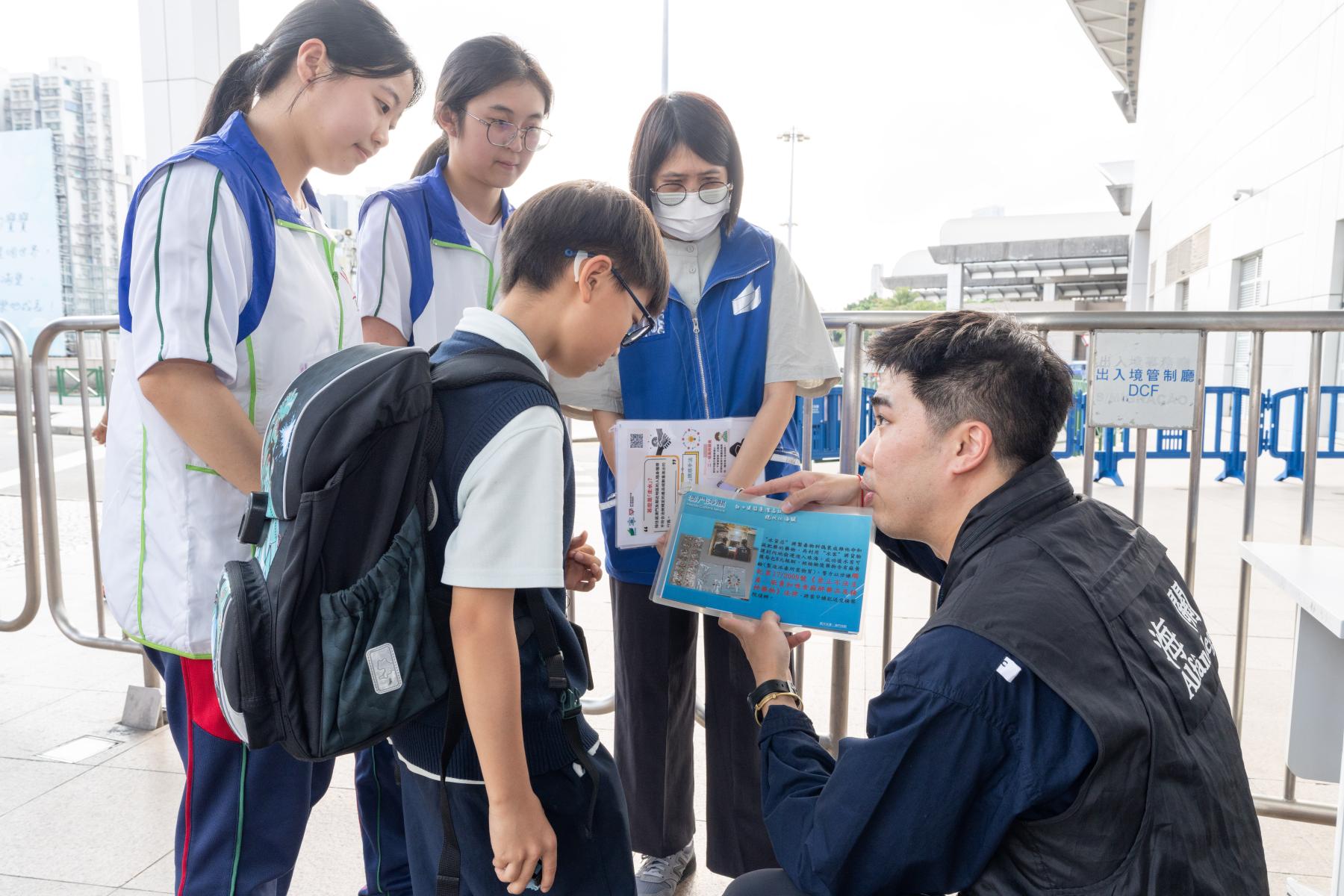 期间,海关人员带领“守正之星”学员,联同教育及青年发展局人员及义工,向途经的青年学生讲解对外贸易活动的相关规定、法律后果及不法分子常用的诱惑手法等;同时提醒青年学生必须坚决拒绝不法分子的利诱及哄骗,切勿参与不法贩运活动,以免触犯相关法律规定,影响自身前途。