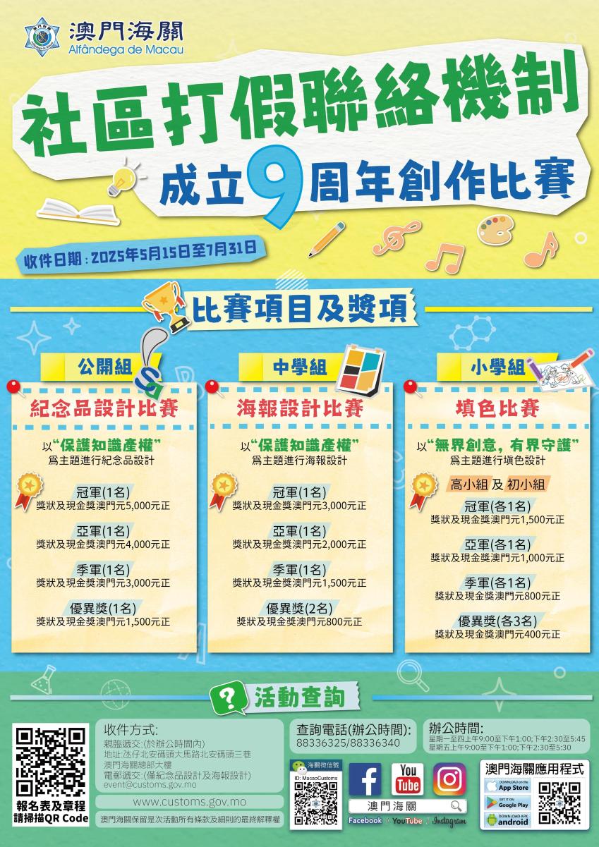 2025年为“社区打假联络机制”成立9周年,海关以“保护知识产权”为主题的“纪念品设计比赛”及“海报设计比赛”,以及以“无界创意,有界守护”为主题的填色比赛,向青少年及公众推广保护知识产权的重要性,得到广大市民踊跃参与。