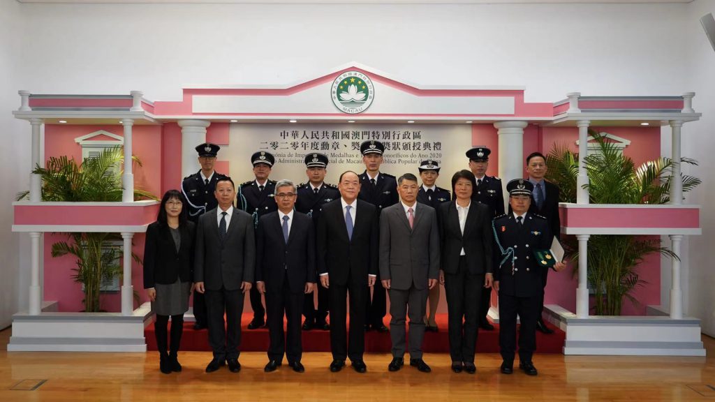 澳门特别行政区政府今日(22日)举行“中华人民共和国澳门特别行政区2020年度勋章、奖章和奖状颁授典礼”,行政长官贺一诚向34名人士及实体颁授勋章、奖章和奖状,表扬他们在个人成就、社会贡献或服务澳门特别行政区方面有杰出的表现,当中澳门海关口岸监察厅获颁授”英勇奖章”,以表扬其在新冠疫情期间执行职务的专业表现。