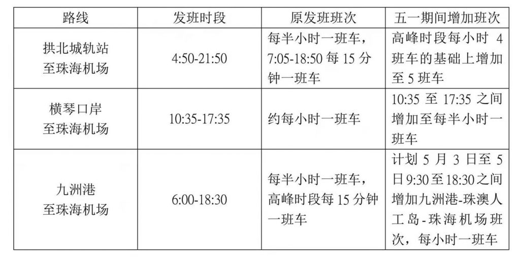 二. 珠海机场运输公司增加拱北(含大桥)、横琴、九洲港口岸发至珠海机场的专线班次,见下表: