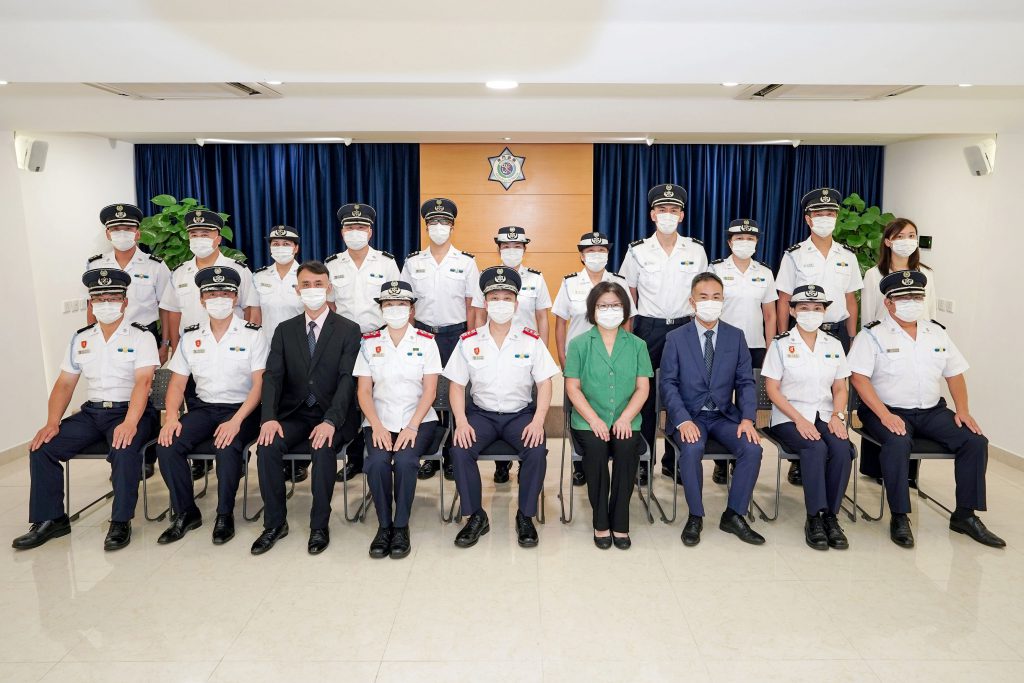 Os oficiais participantes nesta cerimónia incluem a Subdirectora-geral Chau Kin Oi, os assessores e as chefias das subunidades orgânicas.