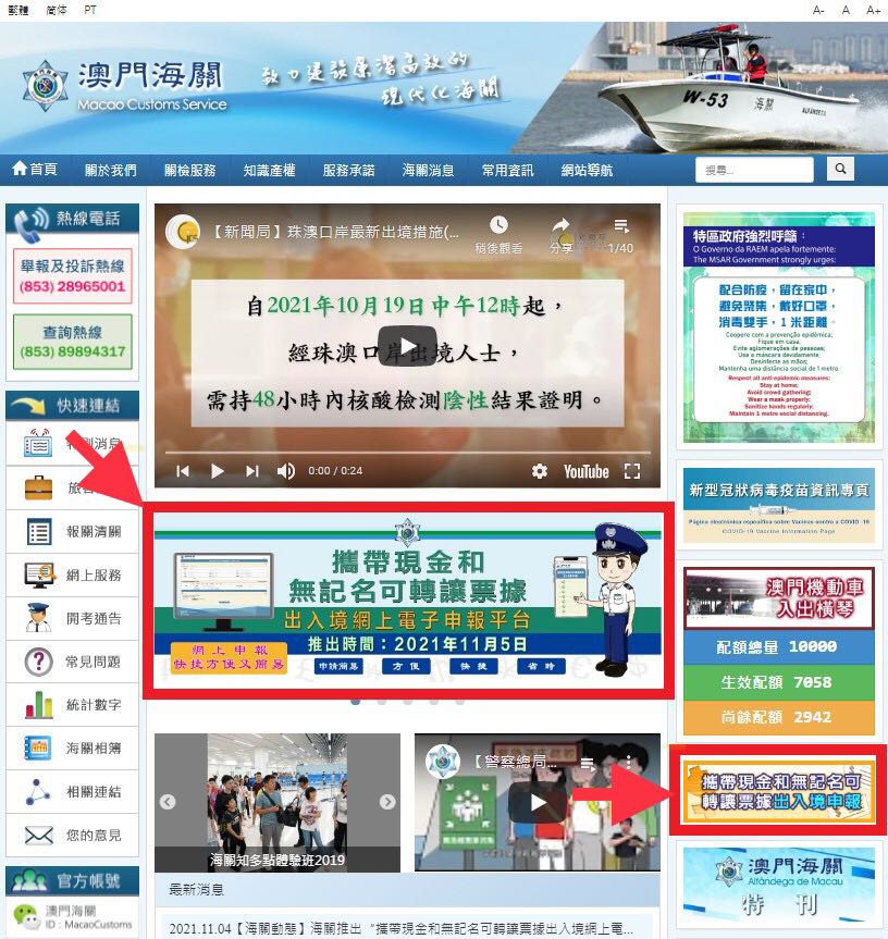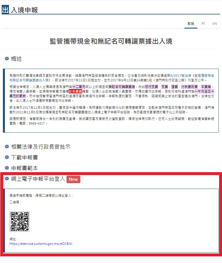 为贯彻落实特区政府发展电子政务的施政方针,澳门海关持续推行及优化各项电子服务,于2021年11月5日正式推出“携带现金和无记名可转让票据出入境网上电子申报平台”。市民或旅客可透过网络登入平台预先进行网上申报,节省现场填写纸本表格的时间,透过电子申报方式提升通关效率。