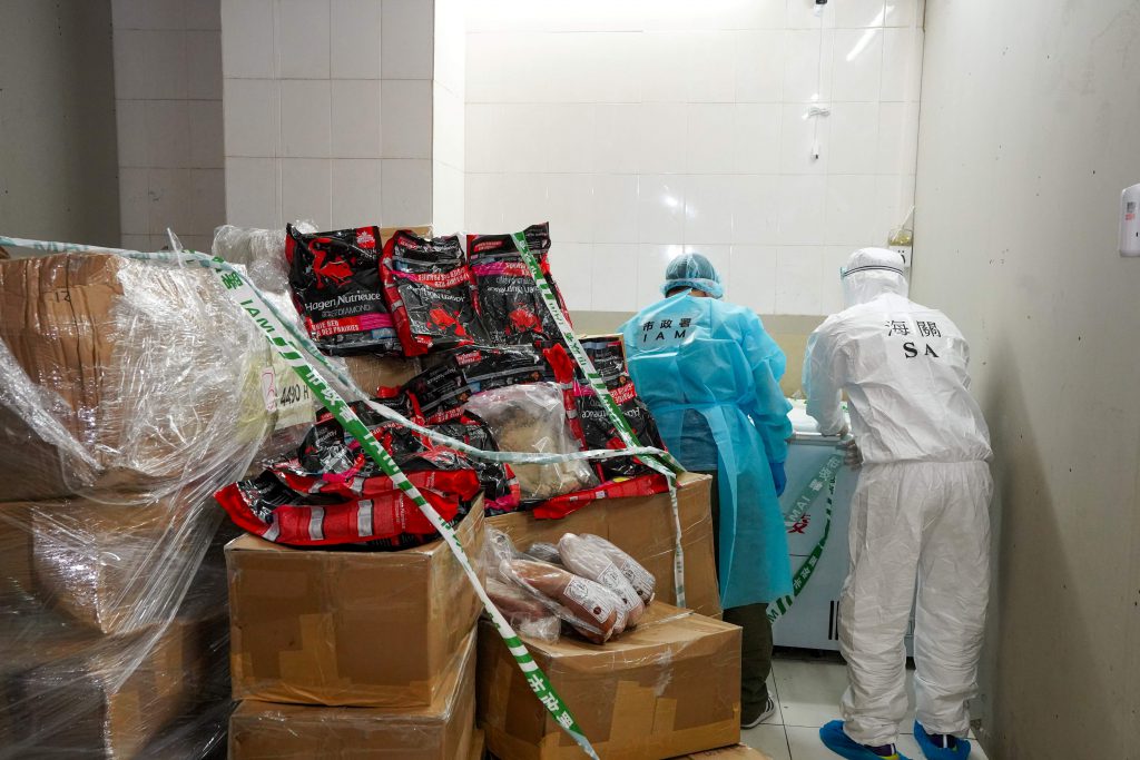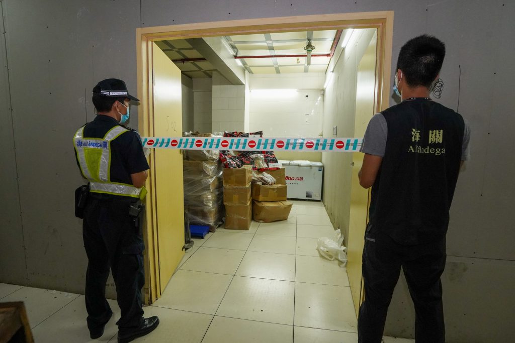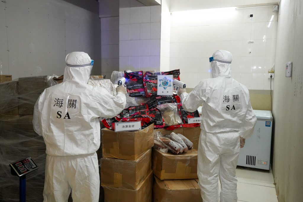 根据情报,关闸口岸附近工厦及商厦单位怀疑有不法分子进行水客活动,海关连日对有关场所进行监察,并于9日下午对位于台山某工业大厦单位采取行动,成功缉获大批未经检疫的冷冻食材(牛肚及牛舌),合共40箱,全数不具备有效的进口文件,其中更有部份以宠物食物外包装作为掩饰,相信为了掩人耳目及方便携带。为减低新冠病毒传播风险,海关执行防疫指引,对所有涉案货物作全面消毒,市政署协助对有关货物进行新冠病毒采样检测,经检测后结果为阴性。