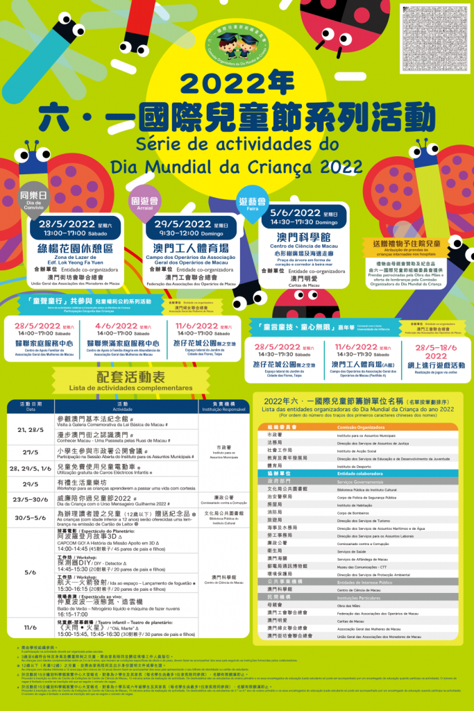 Para celebrar o “Dia Mundial da Criança”, vários departamentos governamentais, serviços públicos e associações comunitárias organizam, em conjunto, este ano, uma série de actividades do “Dia Mundial da Criança”, de modo a celebrar esta festividade com o público de Macau, para que os cidadãos locais possam sentir o clima festivo e celebrar juntos o Dia das Crianças.