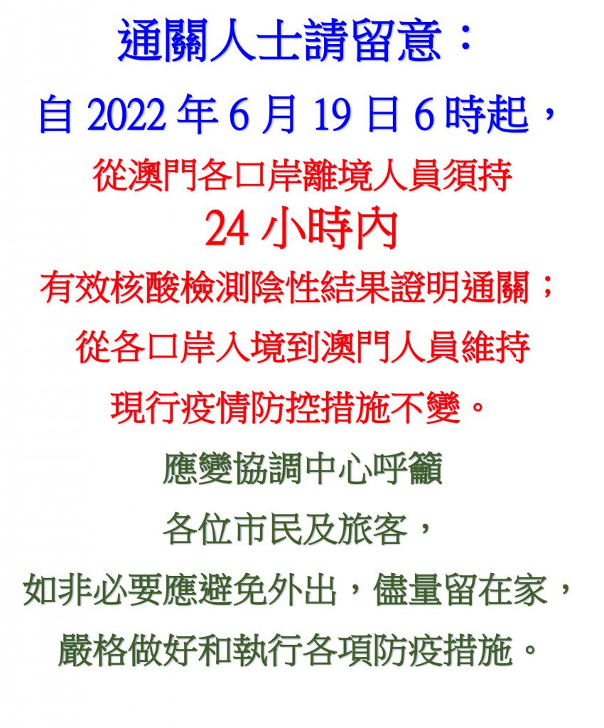 根據疫情防控需要,以及經珠澳聯防聯控機制協商一致,自2022年6月19日6時起,從澳門各口岸離境人員須持24小時內有效核酸檢測陰性結果證明通關;從各口岸入境到澳門人員維持現行疫情防控措施不變。