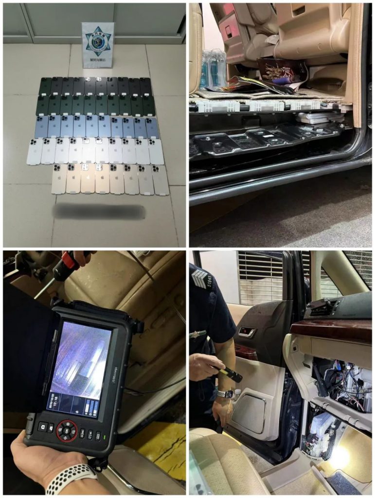 海关经过风险管理分析,预判水客活动将转移至利用跨境车辆及青茂口岸进行,海关针对上述两点加派关员及利用科技手段协助执法。于8月3日至4日期间,海关在关闸口岸出境车道及青茂口岸出境旅客检查区共查获21宗违法出口个案,分别以夹藏车箱暗格、藏身及以其他物品遮掩之方式企图蒙混过关, 查获货物包括美妆产品1,033件、电子产品及零件368件、海味干货4.44公斤、药物61件、酒类4.25升及旧手提电话74部。其中,在8月4日晚上,关员在关闸口岸出境车道对一辆可疑的跨境车辆进行截查期间,利用光纤镜检测设备在副驾驶座收纳箱后之隐密处发现4部旧手提电话,经彻底检查后,再于后座乘客位及车尾箱之暗格内发现44部旧手提电话,合共查获未有作出申报出口的旧手提电话48部。