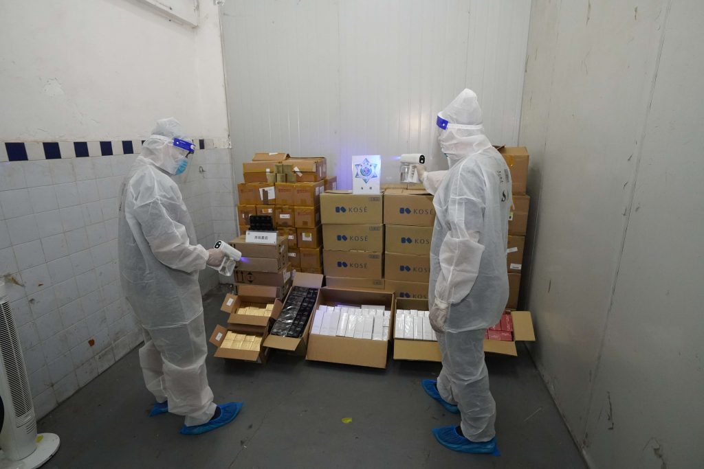 海关根据情报资料显示,北区某商铺从事水客活动,随即展开行动部署。在经过连日的监察后,于15日下午,发现1名女性水客从目标商铺离开并前往关闸口岸离境,关闸海关站关员在出境行李检查区对其作出检查,查获一批美妆产品,该名女性水客承认在上述商铺取货及带货出境。海关见时机成熟,即时采取行动,在目标商铺内发现1名现场负责人,并查获美妆产品约3,700件,总值约92万澳门元。为减低新冠病毒的传播风险,海关执行防疫指引,对涉案货物进行消毒。