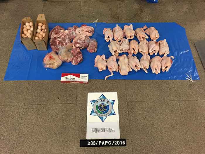 昨午(27日)约四时三十分左右,海关关员在关闸进境车道对一辆自珠海返澳的两地牌私家车作出检查后,发现在其车尾箱内藏有一批生鲜食品,包括有猪肉12公斤、已宰鲜鸡18只、鸡蛋两盒共6公斤及未完税香烟200支。海关已依法起诉涉案司机,并将未经卫生检疫的食材交民政总署处理。涉事司机称车上物品购自珠海作自用。