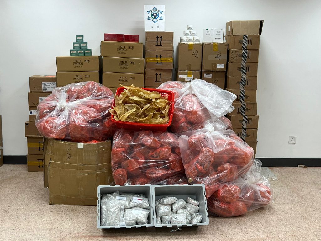 De acordo com as informações recebidas, os SA suspeitaram que uma unidade residencial estava a praticar actividades de comércio paralelo na zona norte, e procederam imediatamente à implementação e à monitorização da unidade relevante. Na manhã do dia 22, o pessoal dos SA verificou a saída de um homem da unidade alvo que caminhava na direcção do Posto Fronteiriço das Portas do Cerco, os SA detiveram-no na saída do posto fronteiriço das Portas do Cerco, no qual foi encontrado uma determinada quantidade de pratas e recibos, o indivíduo admitiu que as mercadorias tinham sido trazidas da unidade em questão e iria transportá-las para fora de Macau. Visto que era um momento ideal, os SA tomaram logo a acção e encontraram uma responsável do local e dois empregados, e 147 kgs de bucho de peixe seco, 1.808 produtos cosméticas e 40 kgs de pratas, num valor total de 1,05 milhões de patacas. Em virtude de minimizar o risco de transmissão da pandemia, os SA realizaram os procedimentos de esterilização a todos os itens apreendidos.
