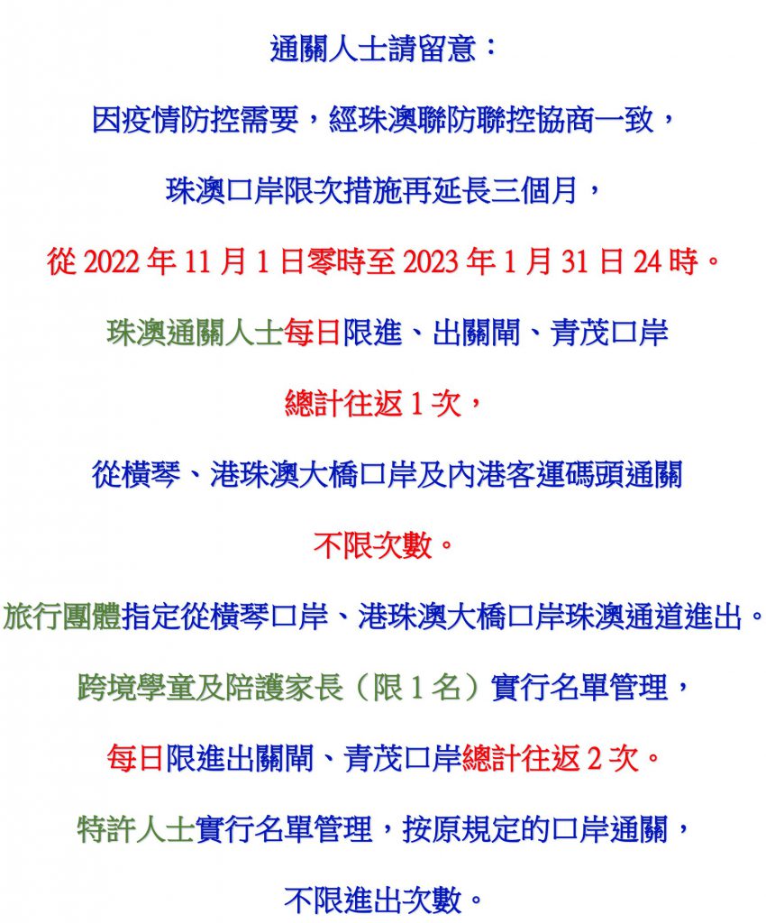 一、珠澳口岸通關場所限次通行措施暫定再延長3個月,從2022年11月1日零時至2023年1月31日24時。
