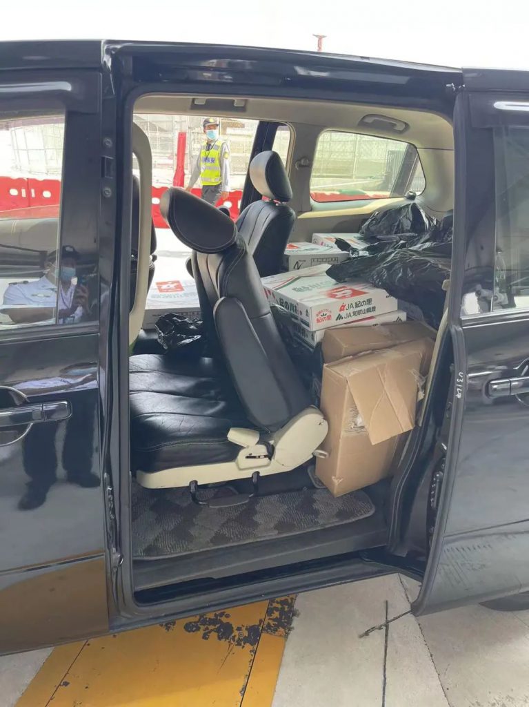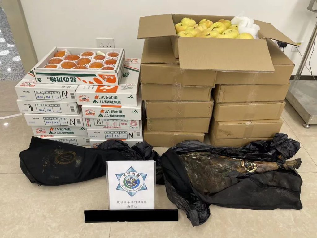 Além disso, ao meio-dia do dia 24, através do alerta antecipado e controlo do sistema de gestão do risco, os SA interceptaram e inspeccionaram um veículo de saída no Posto Fronteiriço Hengqin e descobriram que 22 caixas de fruta de alta qualidade e 2 presuntos caros estavam escondidos nos bancos traseiros, porta-bagagens e pneus sobressalentes do carro, na tentantiva de os contrabandear para fora do país.