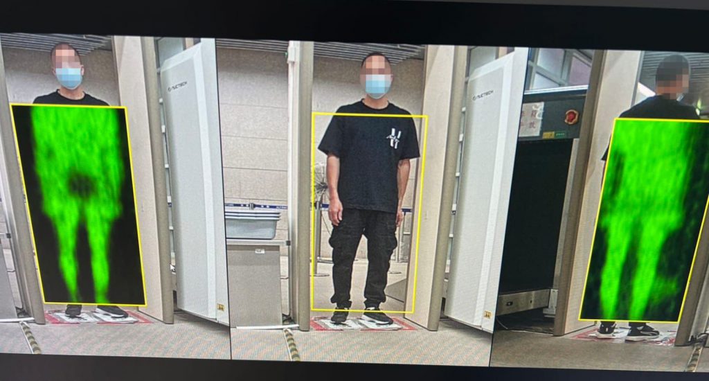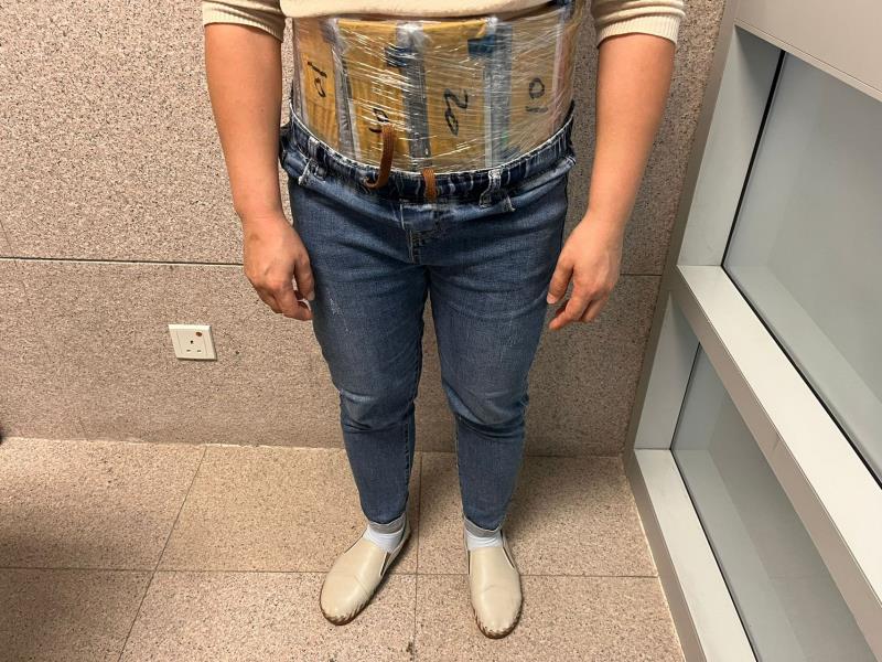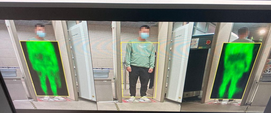 於11月7日晚上,關員在關閘口岸出境旅客檢查區發現一名通關女子步履異常,懷疑其身上藏有可疑物品,遂指示該名女子接受檢查。經使用太赫茲人體成像安檢系統詳細檢查後,關員揭發其將37件美妝產品綁藏腰間及將1支中國白酒藏於胯下試圖偷運出境。