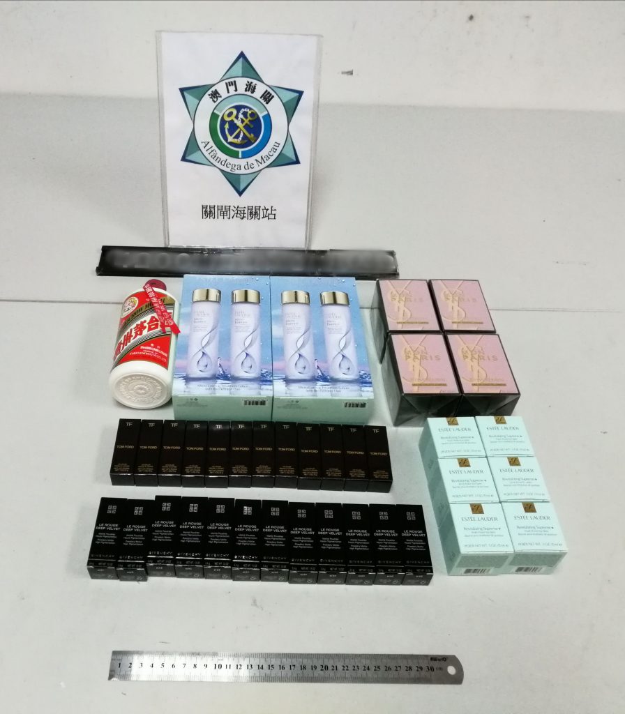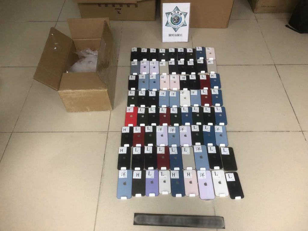 於2022年11月5日至9日期間,澳門海關利用科技手段於關閘及青茂兩口岸截獲共69宗偷運出境個案,當中59宗以隨身攜帶方式、1宗以藏車方式及9宗以藏身方式偷運物品出境個案,查獲主要包括美妝產品1,478件、舊手提電話328部、舊手提電話屏幕連電池22件、電腦處理器160件、相機連鏡頭及配件3部、遊戲卡及光碟39件、藥物146件、名貴食材(海參)8.1公斤、名貴手錶2隻及酒精類飲品約5升等。