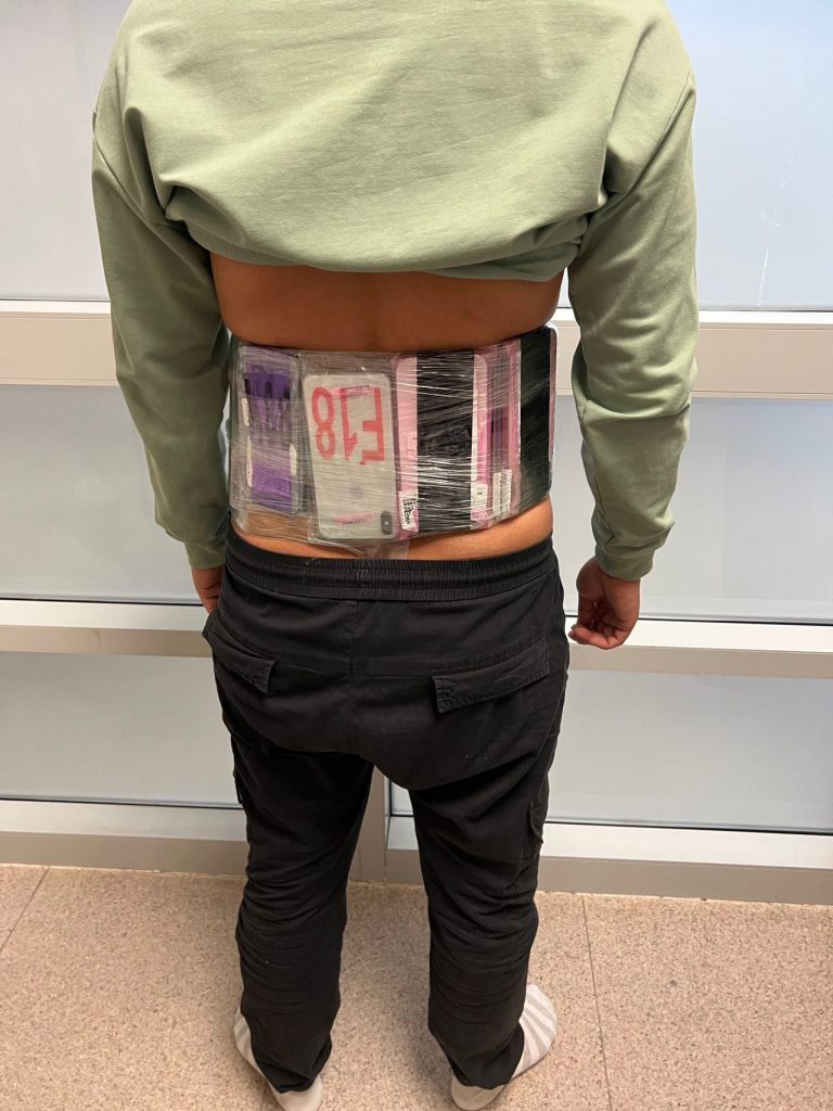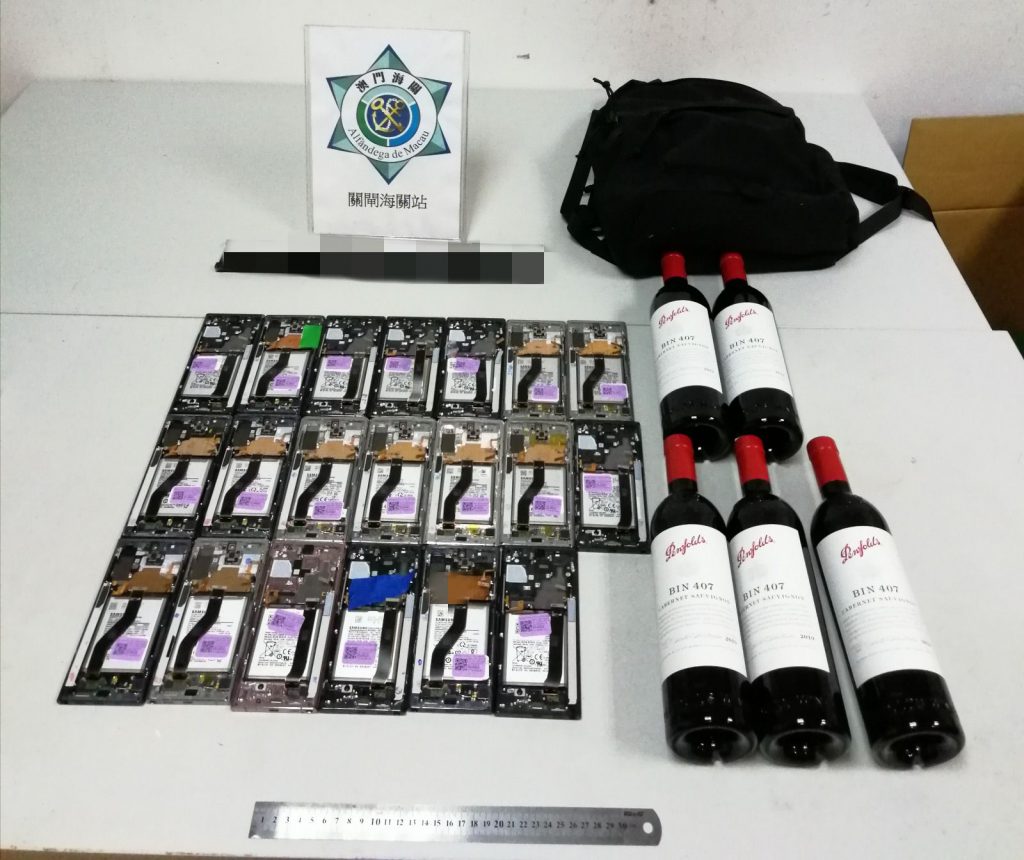 於11月9日晚上,關員在關閘口岸出境旅客檢查區發現一名通關女子神色可疑並混於離境人群中,隨即對其進行截查。經使用太赫茲人體成像安檢系統詳細檢查後,關員揭發其利用保鮮紙將20部舊手提電話綁藏腰間及將5支紅酒藏於背包內試圖偷運出境。