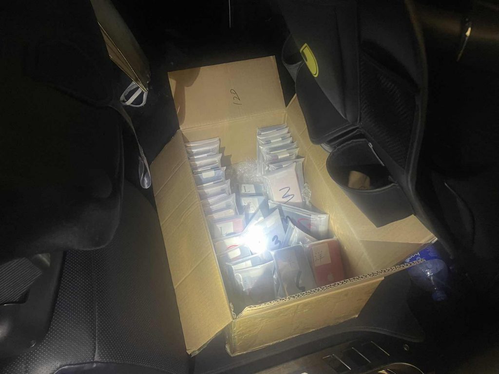 於11月5日晚上,海關透過風險管理系統的預警佈控,在關閘口岸對一輛出境車輛進行截查,期間在車廂內後排座位發現一個可疑紙皮箱,經關員檢查後揭發有人將大量舊手提電話收藏於紙皮箱內企圖偷運出境,查獲舊手提電話共72部。