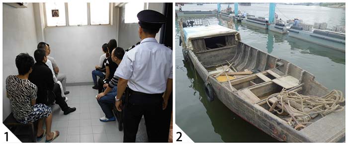 澳门海关关员在凼仔海洋花园对开海面查获一宗偷渡入境案件,截获一艘机动木舢舨,拘捕一名男性蛇头及四男二女的非法入境者。