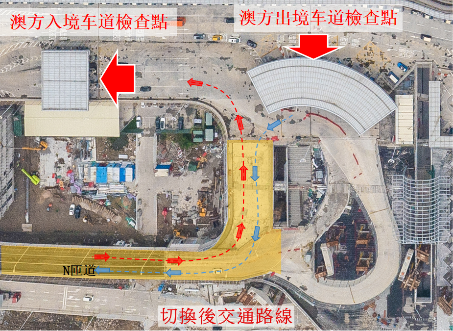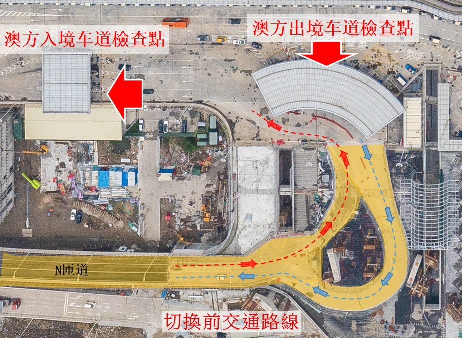 為配合橫琴口岸查驗場二期項目建設工程,橫琴口岸澳門口岸區二層平台出入境車道的局部路段將於2022年11月14日下午三時整進行調整,出入境車輛須由原通道(圖一)切換至新通道(圖二)通行。