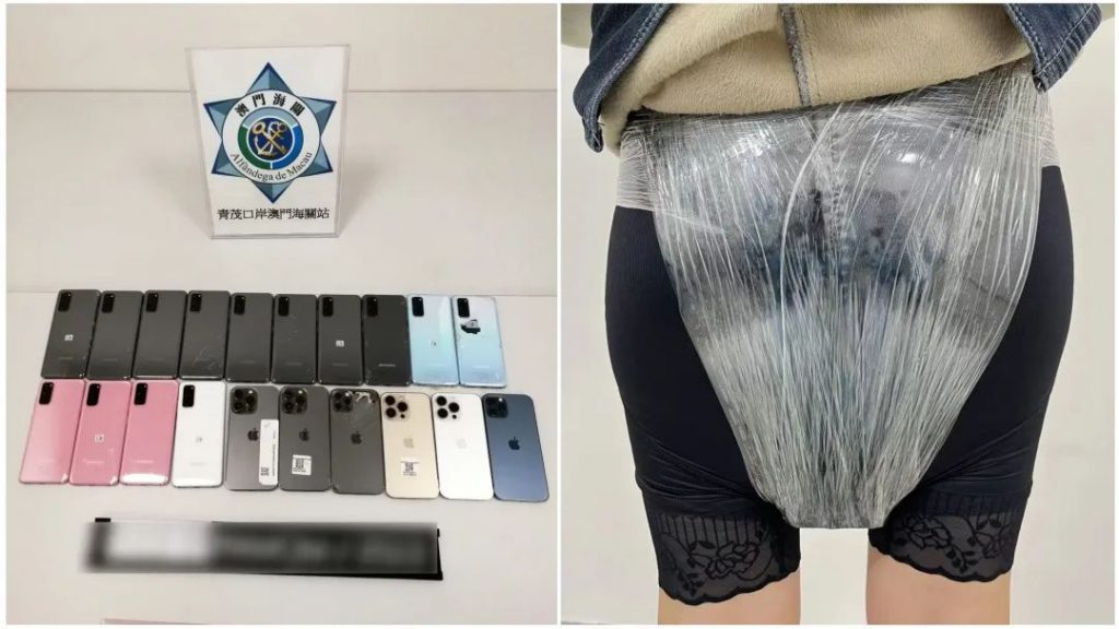 Às 21h do mesmo dia, os verificadores alfandegários encontraram uma mulher na área de inspecção de passageiros de saída do Posto Fronteiriço Qingmao que estava a realizar a passagem fronteiriça com uma conduta suspeita, após inspecção por verificadores alfandegários com um aparelho portátil de detector de metais, foi revelado que a mulher tinha usado filme plástico para amarrar 20 telefones móveis antigos à cintura e à virilha, tentando contrabandeá-los para fora do território / Região / Macau.
