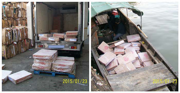 于2015年1月23日,海关口岸监察厅特遣队关员于早上约九时在内港22号码头内巡查时,发现一辆货车停泊在内港22号码头海边,当时正由一名男子将一批冻肉搬落停泊在码头旁的一艘内地机动船只上。关员随即截停上述货车、人士及在码头旁停泊一艘机动船只的两名船员,后证实在现场发现共100箱鸡翼(1500KG)及23箱香肠(250.9KG),合共价值澳门币3万多元,准备非法出口到内地。