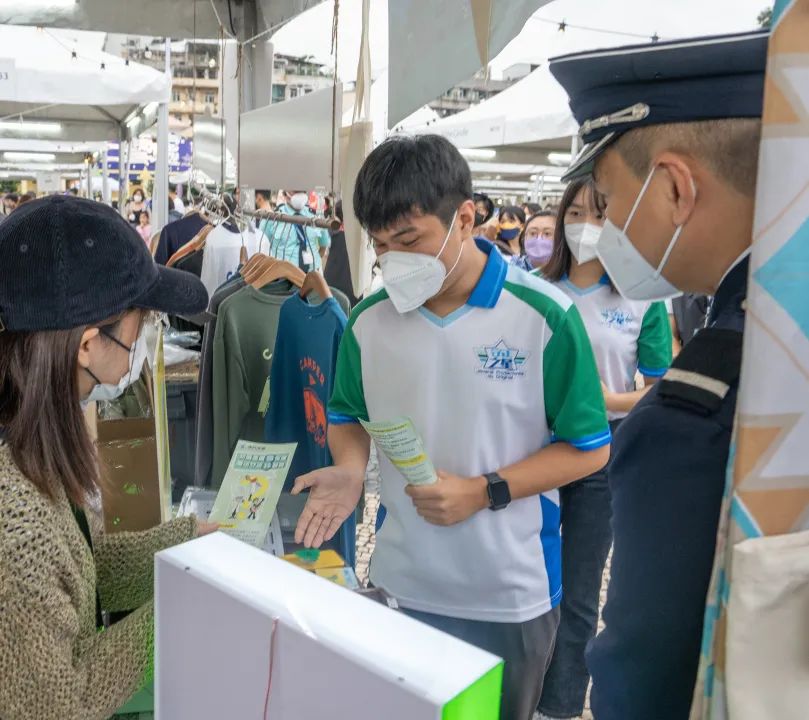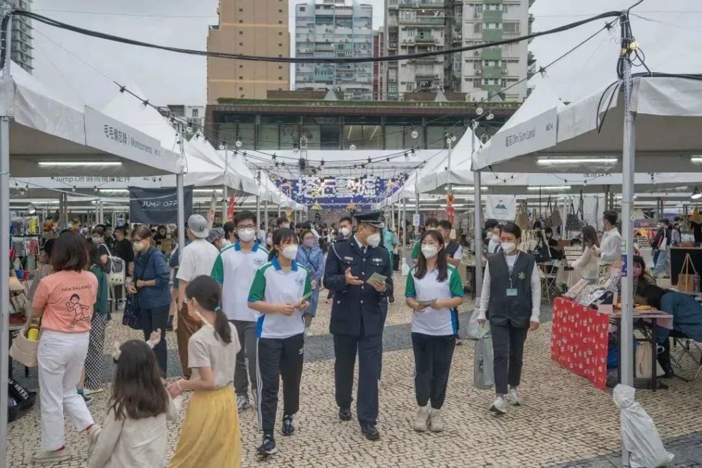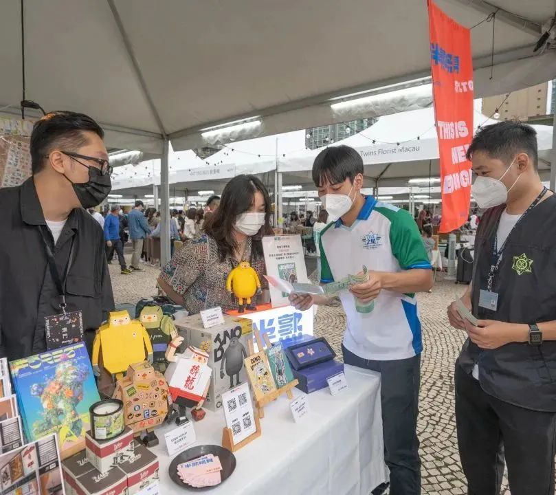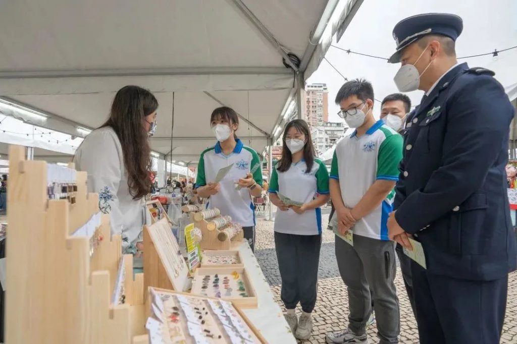 「守正之星」學員在海關人員的帶領下前往塔石廣場,向塔石藝墟的攤位經營人派發宣傳小冊子,宣講保護知識產權的守法訊息,同時讓學員們進一步瞭解本澳原創產業,明白保護知識產權的重要性,為守護原創產業發展出一分力。