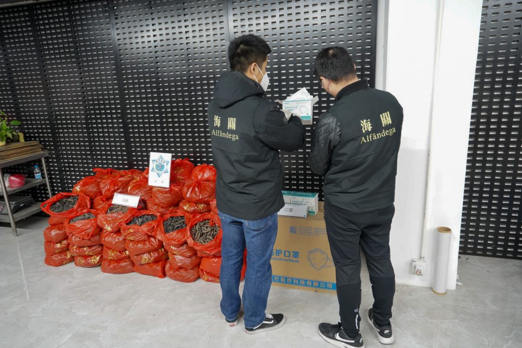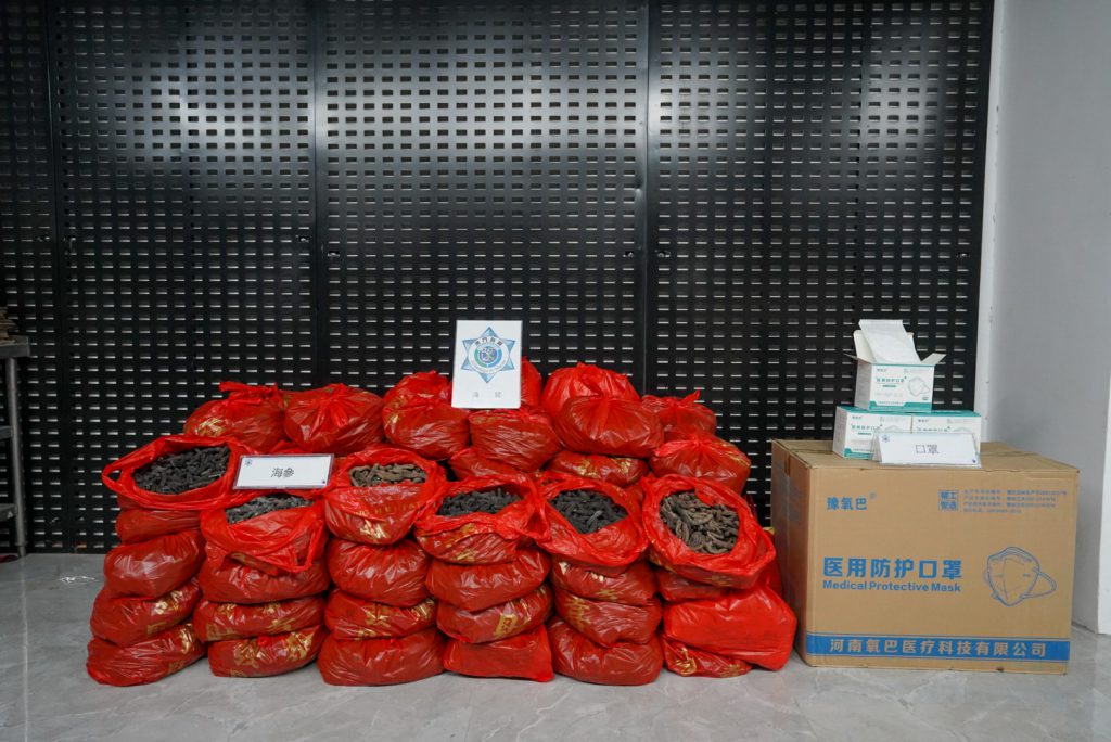 海關見時機成熟立即對目標單位採取行動,在單位內截獲1名女性負責人及1名女性水客,查獲乾海參90袋約重360公斤及口罩1箱共60盒。連同關閘口岸查獲女性水客攜帶的1箱口罩,行動中查獲的貨物估值約15萬澳門元。由於相關貨物不具備進出口申報文件及來源證明,為減低新冠病毒傳播的風險,海關根據防疫指引,對查獲的貨物進行消毒。