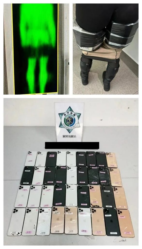 於4日中午,關員在關閘口岸出境旅客檢查區發現一名混跡於離境人群中的通關女子,其腿部明顯有異物隆起,關員遂指示該名女子接受檢查。經使用太赫茲人體成像安檢系統詳細檢查後,揭發該名女子將36部舊手提電話綁藏於大腿,試圖偷運出境。