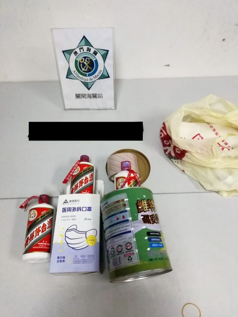 Na tarde do dia 12 deste mês, os verificadores alfandegários encontraram uma mulher com aparência suspeita na área de inspecção de passageiros de saída do Posto Fronteiriço das Portas do Cerco, que segurava itens pesados e suspeita de esconder itens, depois de usar a máquina de raio-X para verificar a sua bagagem de mão, foi descoberto que a mulher tinha usado a lata de leite em pó e a caixa das máscaras como cobertura para esconder 3 licores chineses, na tentativa de contrabandeá-los para fora de Macau.