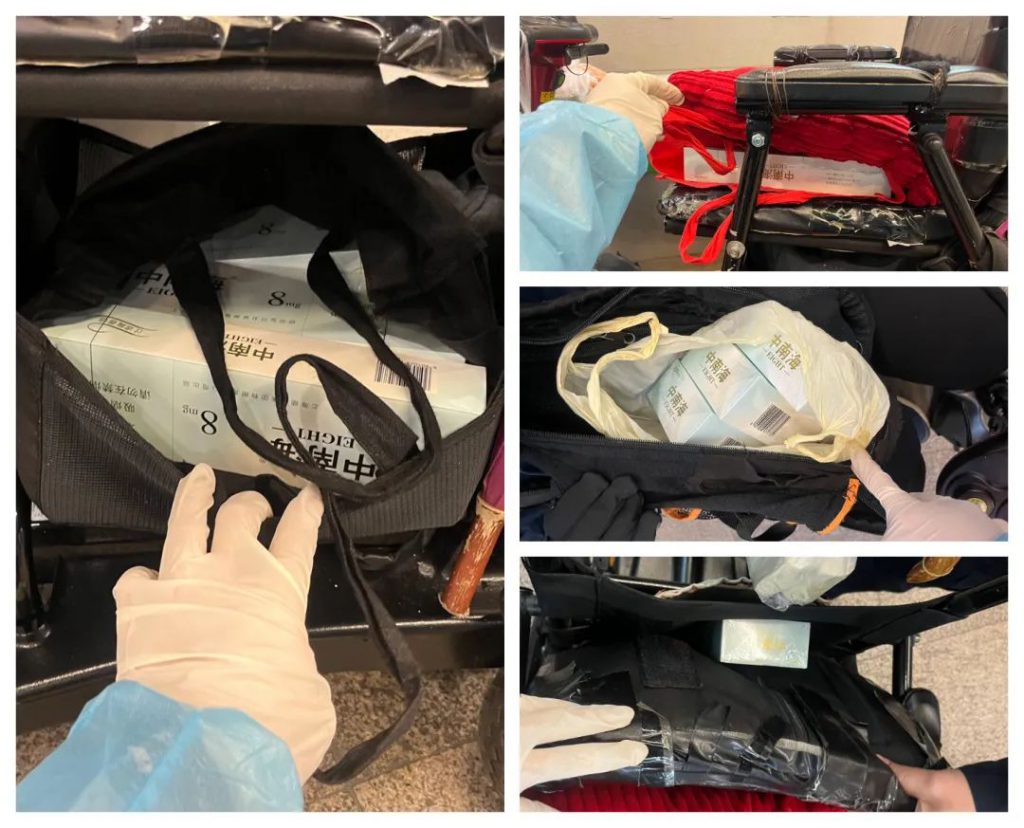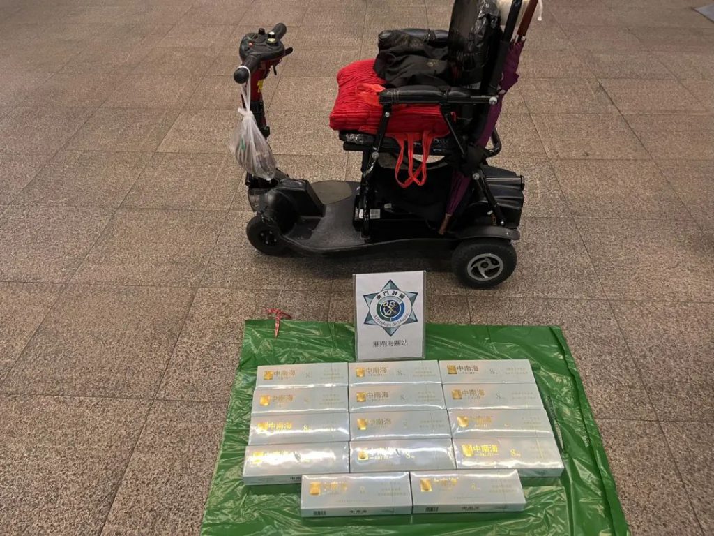 Na tarde do mesmo dia, os verificadores alfandegários na zona de inspecção de passageiros no Posto Fronteiriço das Portas do Cerco constataram que uma pessoa em cadeira de rodas eléctrica parecia diferente e tentava misturar-se com a multidão, evitando a visão dos verificadores alfandegários, portando interceptaram-na para inspecção, após a verificação detalhada, foram apreendidos um total de 2.800 cigarros que não pagaram o imposto devido escondidos na bolsa sob a cadeira de rodas eléctrica, no dorso da cadeira de rodas e na sua bagagem de mão, envolvendo um valor de imposto de cerca de 4.200 patacas.