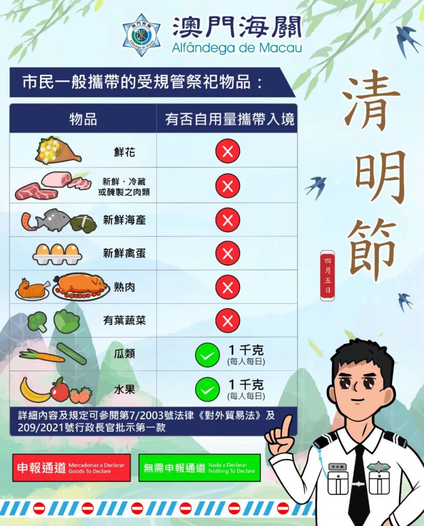 清明節是中國傳統節日,也是居民拜祭先人的重要日子。孝子賢孫多會帶備鮮花、肉食、水果等物品祭祖,部分回鄉掃墓的市民亦會在完成祭祀後將祭品帶回澳門,然而,部份物品的入境受法律規範,市民須注意及遵守相關規定。