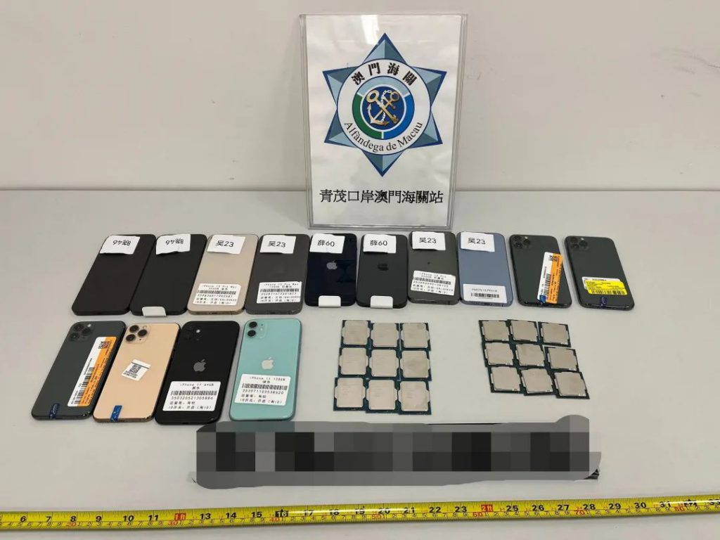 于5月17日傍晚,关员在青茂口岸出境旅客检查区发现一名通关男子眼神闪躲、神色慌张、混迹于离境人群中,怀疑藏有可疑物品,经检查后,揭发该名男子将14部旧手提电话及18件计算机处理器藏于腰间,企图蒙混过关。
