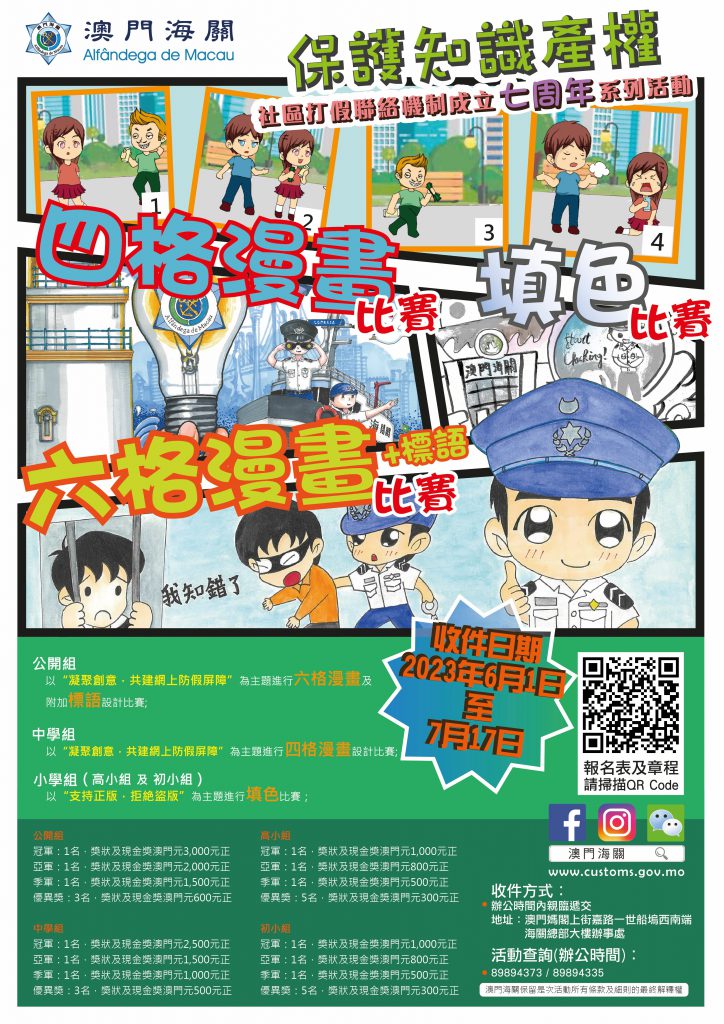 今年是澳門海關成立“社區打假聯絡機制”七周年,為進一步宣揚保護知識產權的理念,提高市民大眾的守法意識,海關舉辦“保護知識產權”漫畫創作、標語設計及填色比賽,自6月1日至7月17日期間對外徵集作品。各項比賽均設有豐富獎項,歡迎全澳學生及市民踴躍參與。
