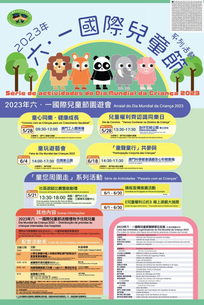 Para celebrar o “Dia Mundial da Criança de 1 de Junho” , vários departamentos governamentais, serviços públicos e associações comunitárias organizam, em conjunto, este ano, uma série de actividades do “Dia Mundial da Criança de 1 de Junho” de 2023, de modo a celebrar esta festividade com o público de Macau, para que os cidadãos locais possam sentir o clima festivo e celebrar juntos o Dia das Crianças.