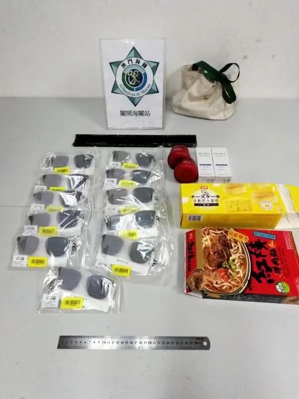 在警察總局統籌下,澳門海關持續開展【雷霆2023】行動,加強口岸執法。於6月26日,關員在關閘口岸出境旅客檢查區發現一名通關女子混跡於離境人群中,形跡可疑,隨即對其進行截查,經關員檢查後,除發現4支沒有申報之美妝產品外,亦揭發該名女子利用食品包裝盒作掩飾收藏11副名貴太陽眼鏡,試圖矇混過關。