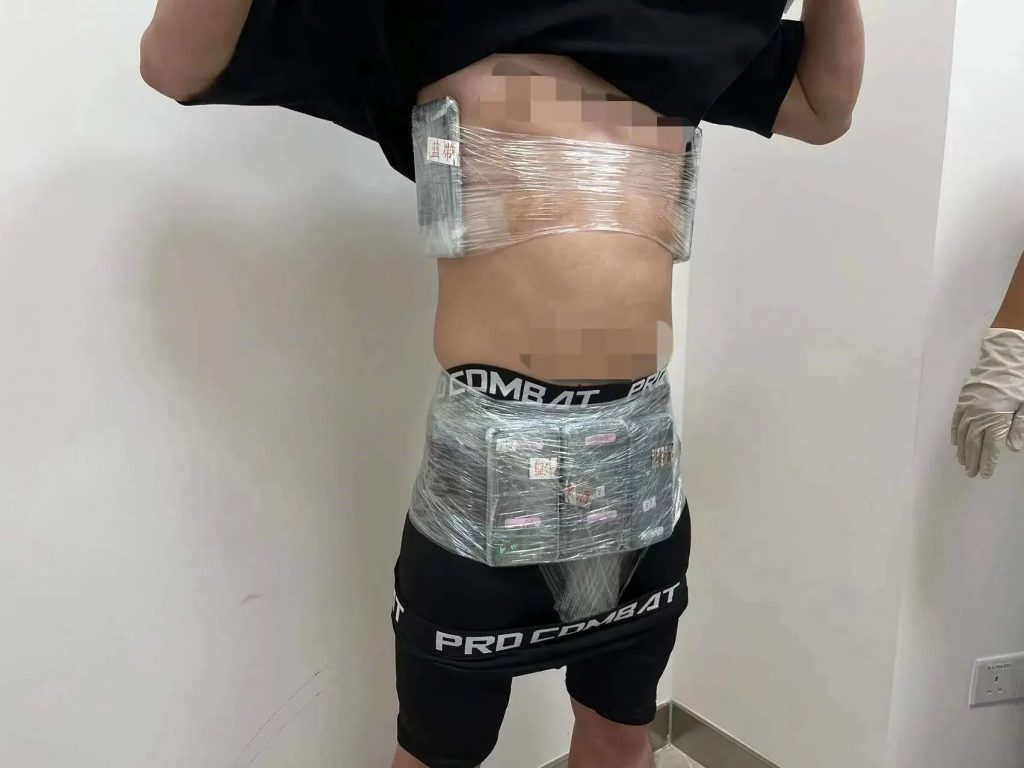同日晚上,海关关员在青茂口岸出境旅客检查区发现一名通关男子肢体动作不协调,眼神故意回避关员,怀疑其进行不法活动。经检查后发现其利用塑料膜将28部旧手提电话绑缠于上半身及胯下,试图蒙混过关。