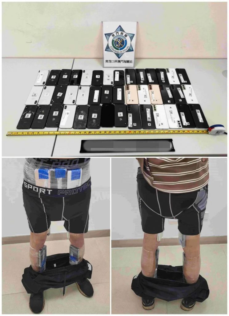 Ao meio dia do dia 21, o verificador alfandegário em serviço no Posto Fronteiriço de Macau da Ponte Hong Kong-Zhuhai-Macau encontrou um passageiro de entrada com movimentos suspeitos e anormais, solicitou que fosse submetido à inspecção, e após uma inspecção detalhada através do Sistema de inspecção da segurança por scanner corporal Terahertz e do Sistema de inspecção por raio-X, foram encontradas na cintura e mochila 103 unidades de telemóvies usados amarrados e escondidos na tentativa de serem transportadas para Macau.