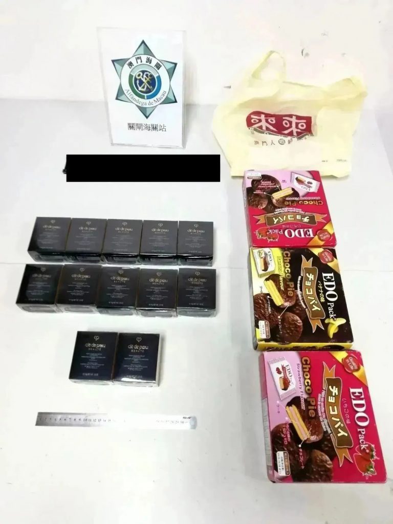 No 2.º caso, na tarde do dia 2 de Novembro, o verificador alfandegário interceptou um indivíduo que escondia 12 produtos cosméticos em caixas de comida na tentativa de serem transportados para o Interior da China.