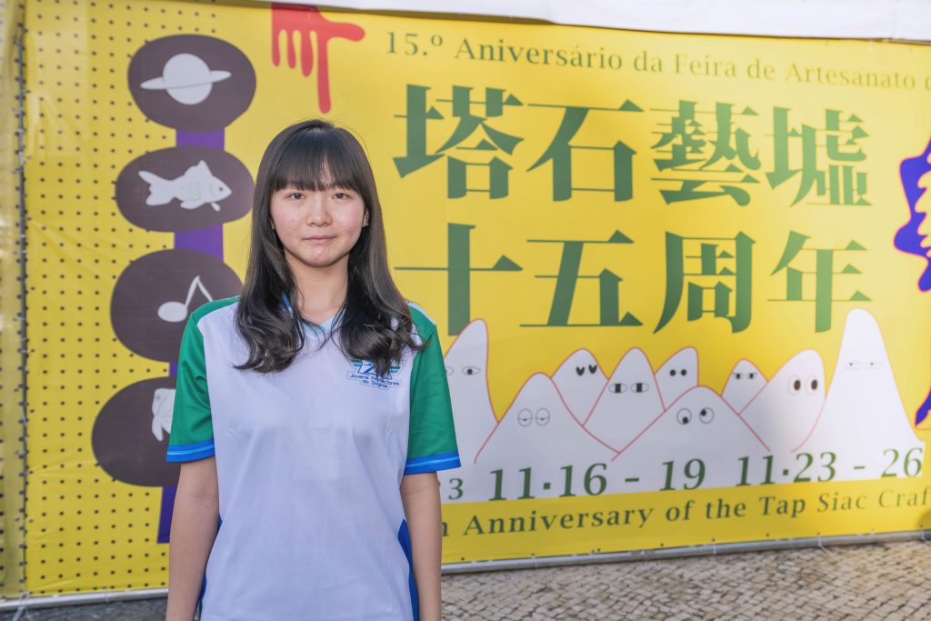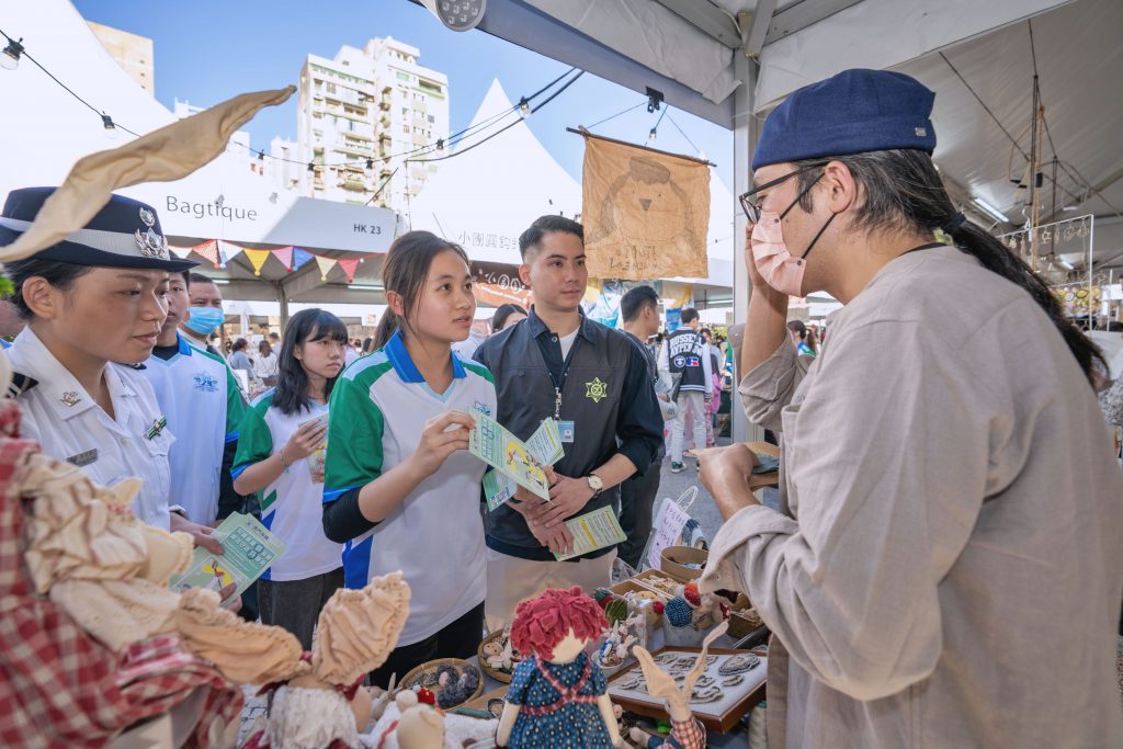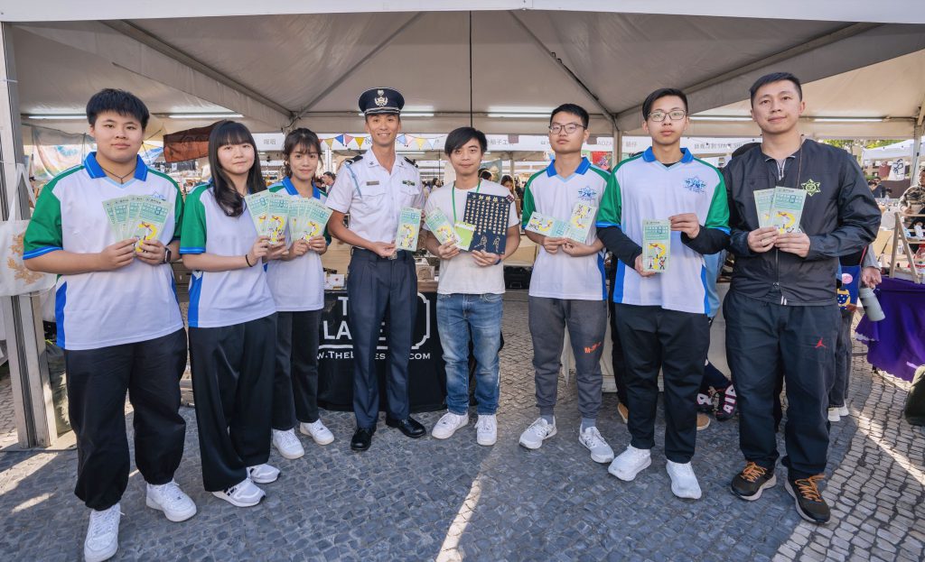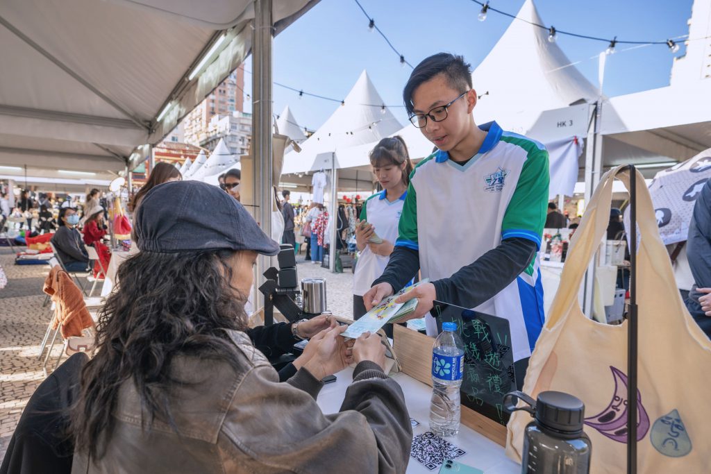 海關人員帶領「守正之星」學員前往塔石廣場,向塔石藝墟的攤位經營人派發宣傳小冊子,一同宣講保護知識產權的守法訊息,同時讓學員進一步瞭解本澳原創產業,明白保護知識產權的重要性。