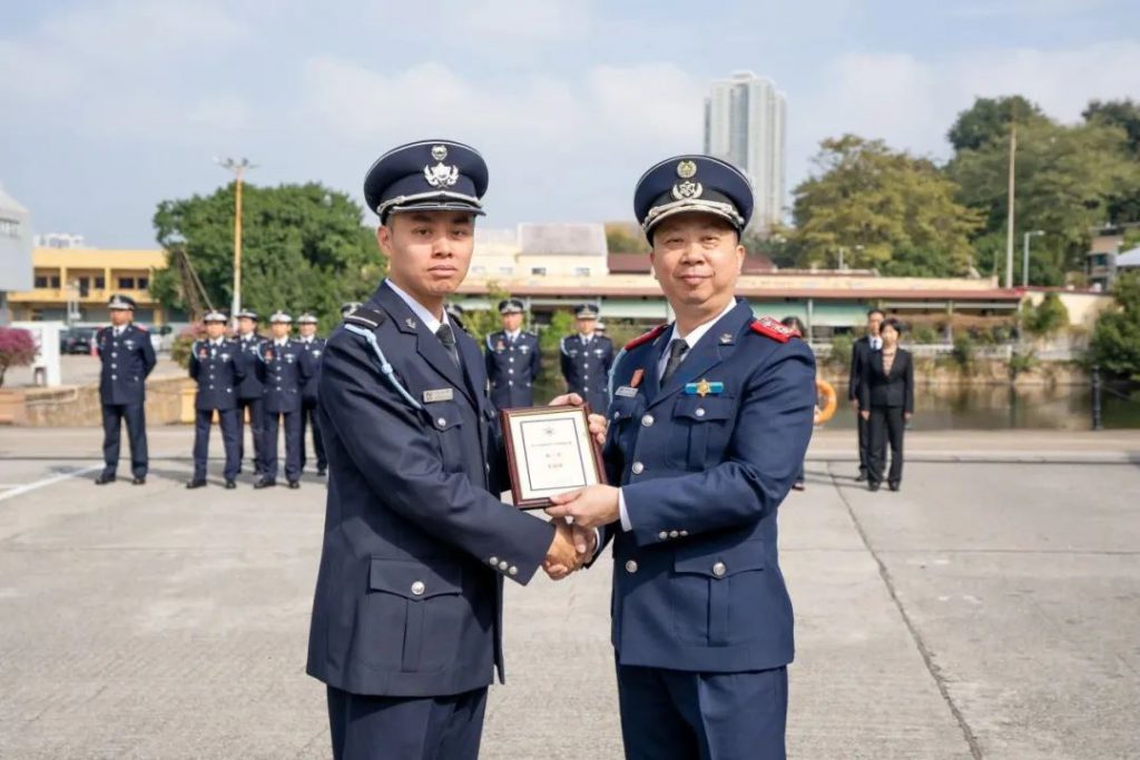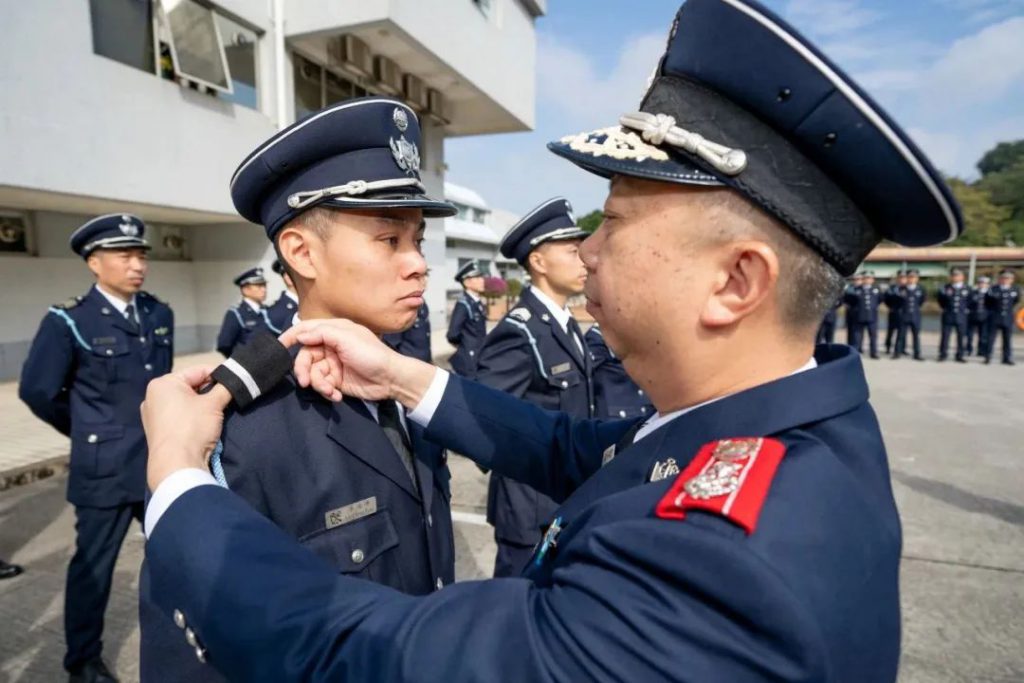 各晉升人員進行宣誓後,由海關關長黃文忠及副關長李煜輝分別為各人佩戴肩章,正式晉升成為副關務督察,儀式上同時亦向獲得培訓課程總成績優異獎的人員李晴峰頒發獎項。