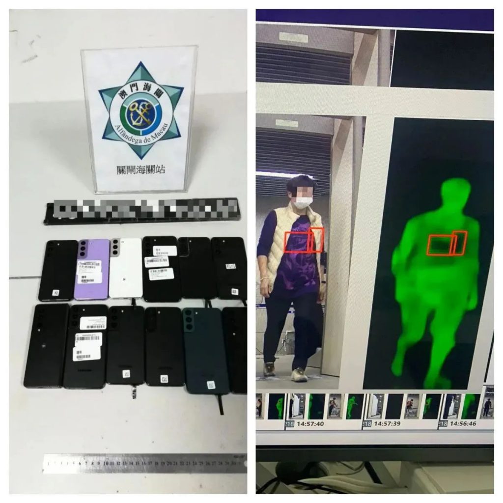 于12月28日下午,海关关员透过太赫兹人体成像安检系统辅助执法,在关闸口岸出境旅客检查区截获2宗以藏身方式偷运旧手提电话出境个案,共2名人士涉案,各人分别将12部旧手提电话绑藏于身上偷运出境,查获货物均不具备有效的申报文件。