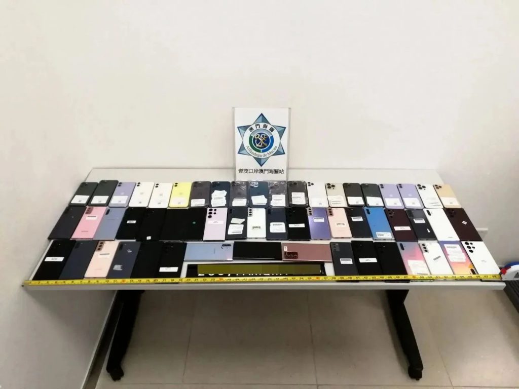 于12月29日中午,海关关员在青茂口岸出境旅客检查区发现一名通关男子肢体动作不协调,怀疑其藏有可疑物品。关员指示该名男子进行金属探测门检查,金属探测门发出警示声响,经详细检查后,发现该名男子将56部旧手提电话绑藏于背部、腰间及大腿,试图偷运出境。