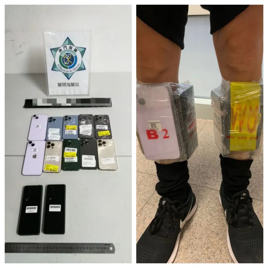 Na noite do mesmo dia, os verificadores alfandegários em serviço na zona de inspecção para os passageiros de saída do mesmo posto fronteiriço interceptaram mais 1 indivíduo do sexo masculino de saída que transportava, ilegalmente e por forma oculta no corpo, 25 telemóveis usados amarrados na cintura, coxa e pernas com o intuito de levá-los para fora de Macau.
