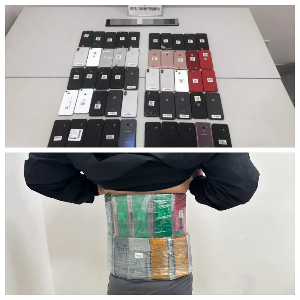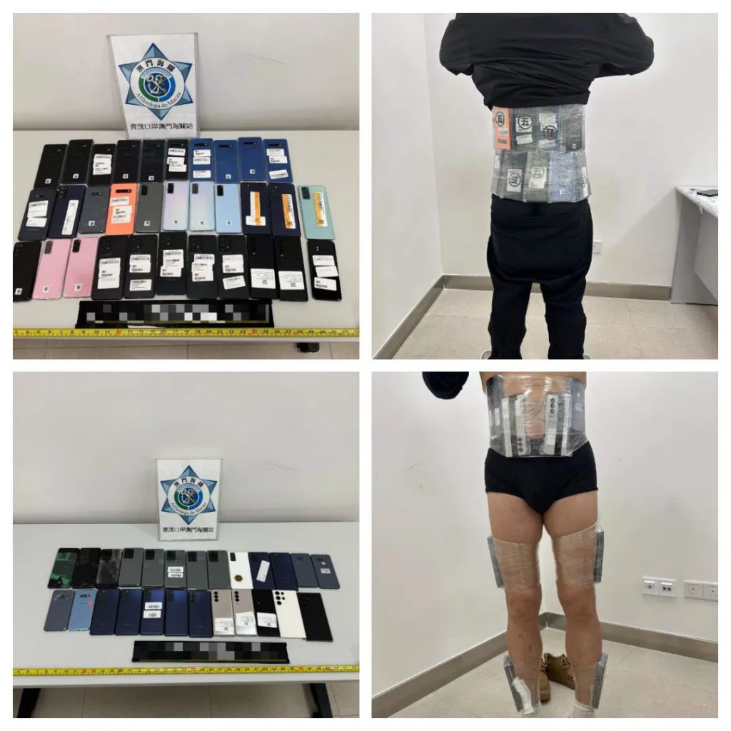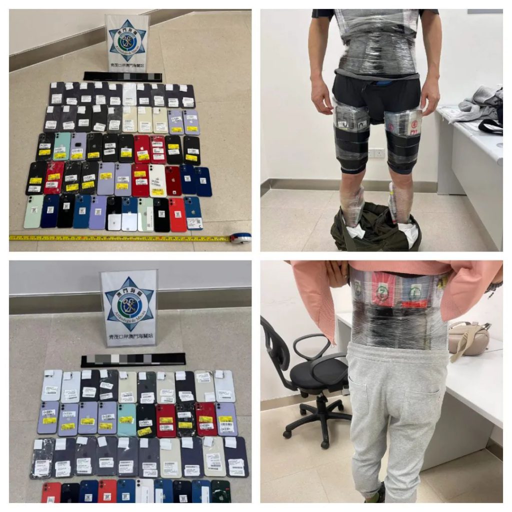 Na manhã do dia 11 de janeiro, os verificadores alfandegários encontraram 1 indivíduo do sexo masculino que estava a realizar a passagem fronteiriça com um movimento rígido dos membros na zona de inspecção de passageiros de saída no Posto Fronteiriço de Qingmao, suspeitaram que ele tinha itens suspeitos escondidos no seu corpo. Após uma inspecção detalhada, foi verificado que o indivíduo em questão tinha usado filme plástico para amarrar e esconder, respectivamente, na cintura, coxa e pernas, um total de 50 telemóveis usados, na tentativa de contrabandeá-los para fora de Macau.