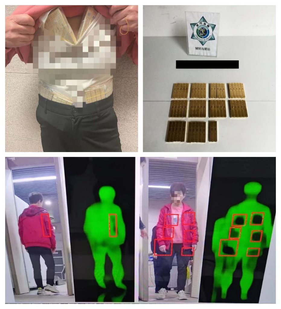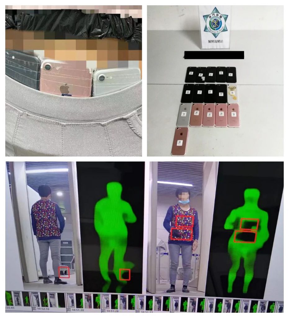 於1月22日中午,海關關員利用太赫茲人體成像安檢系統輔助執法,於關閘口岸共截獲2宗以藏身方式偷運舊手提電話出境個案,共2名人士涉案,各人分別將舊手提電話綁藏於身上偷運出境,共查獲30部手機,查獲貨物均不具備有效的申報文件。