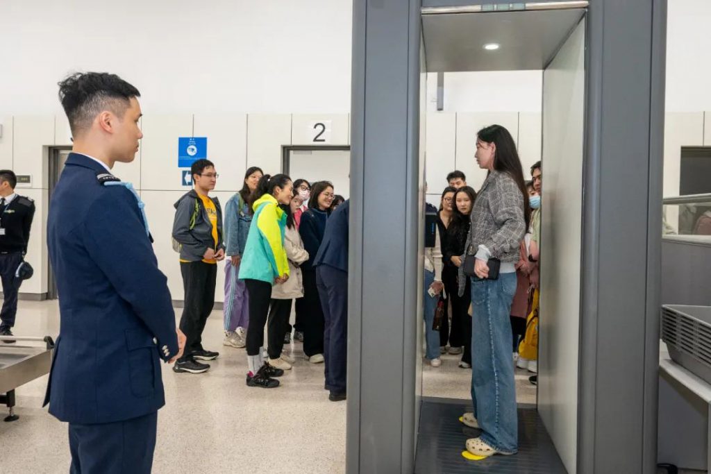 参观者在海关人员带领下进入港珠澳大桥海关站关检区,实地了解海关人员的日常工作,以及认识不同类型关检设备的功能及运作。参观期间,海关人员让参观者亲身体验毫米波人体安全检查系统等新型关检设备,让参观者进一步了解关检设备的运作及功能。